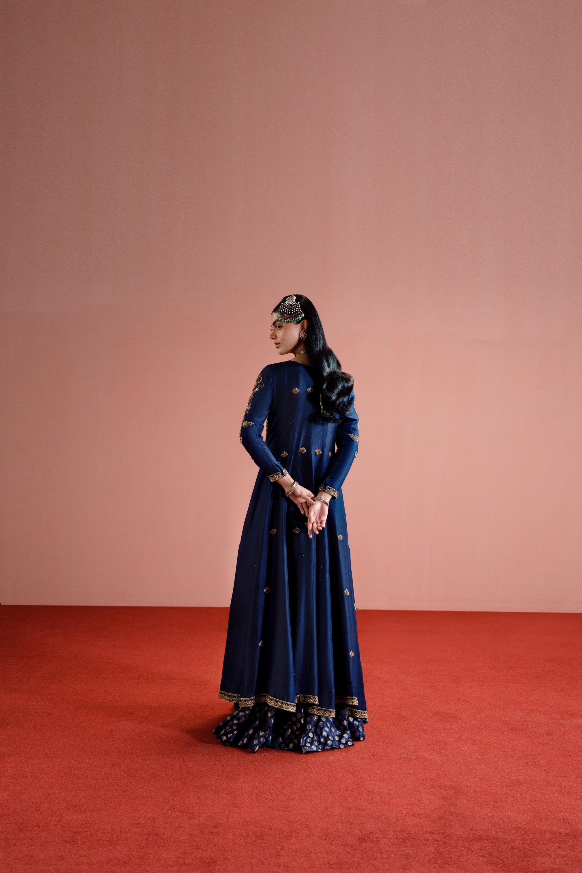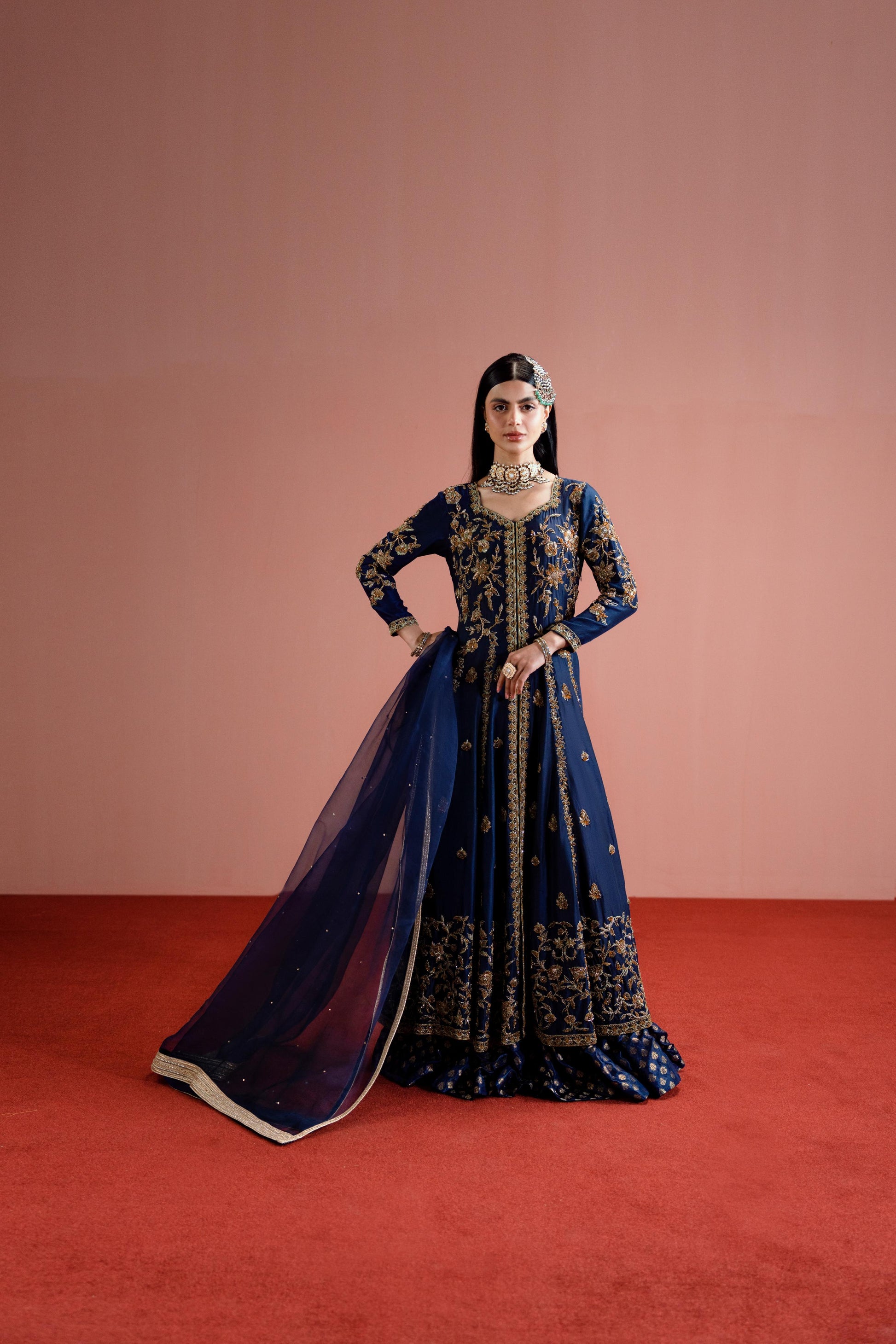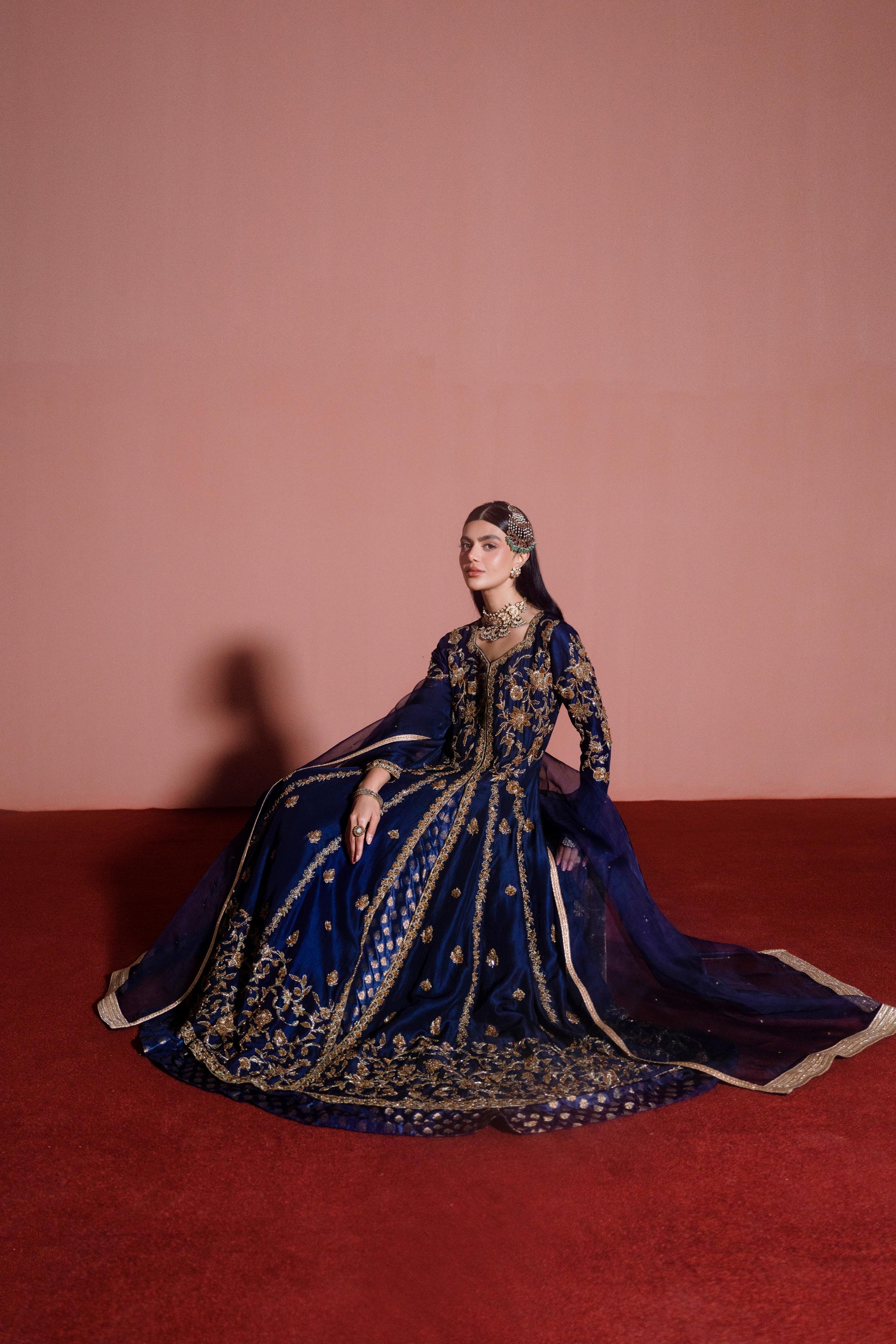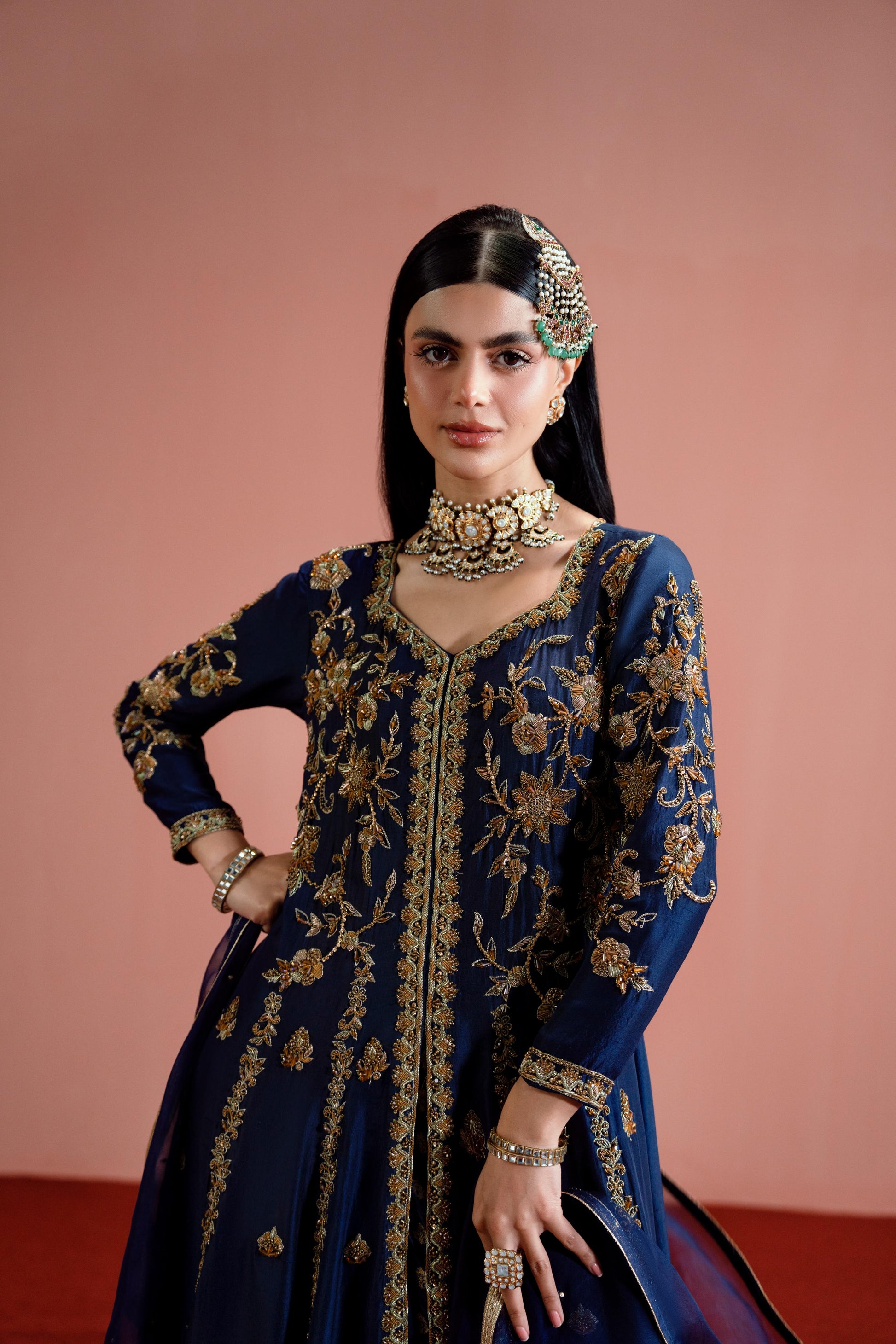 Irresistibly striking, Zaleh makes a statement silhouette. Crafted on blush pink organza shirt richly embellished with kora, dabka, pearls and cutdana adornments, paired with banarsi farshi sharara and printed organza dupatta with intricate embroidery and sequins details on the borders and lace detailing. Making the piece perfect choice for your special occasion.