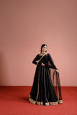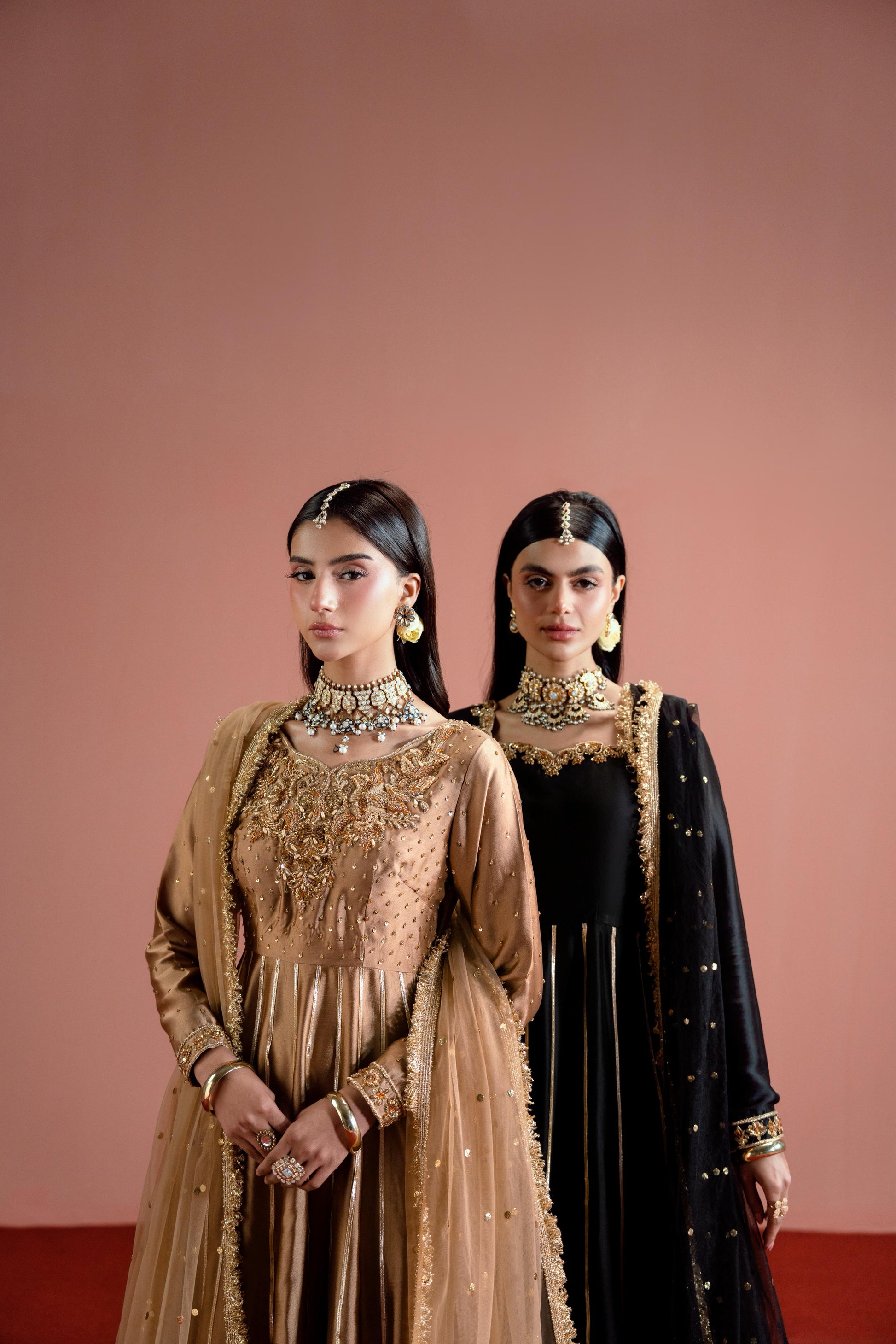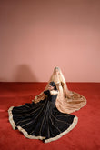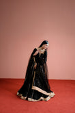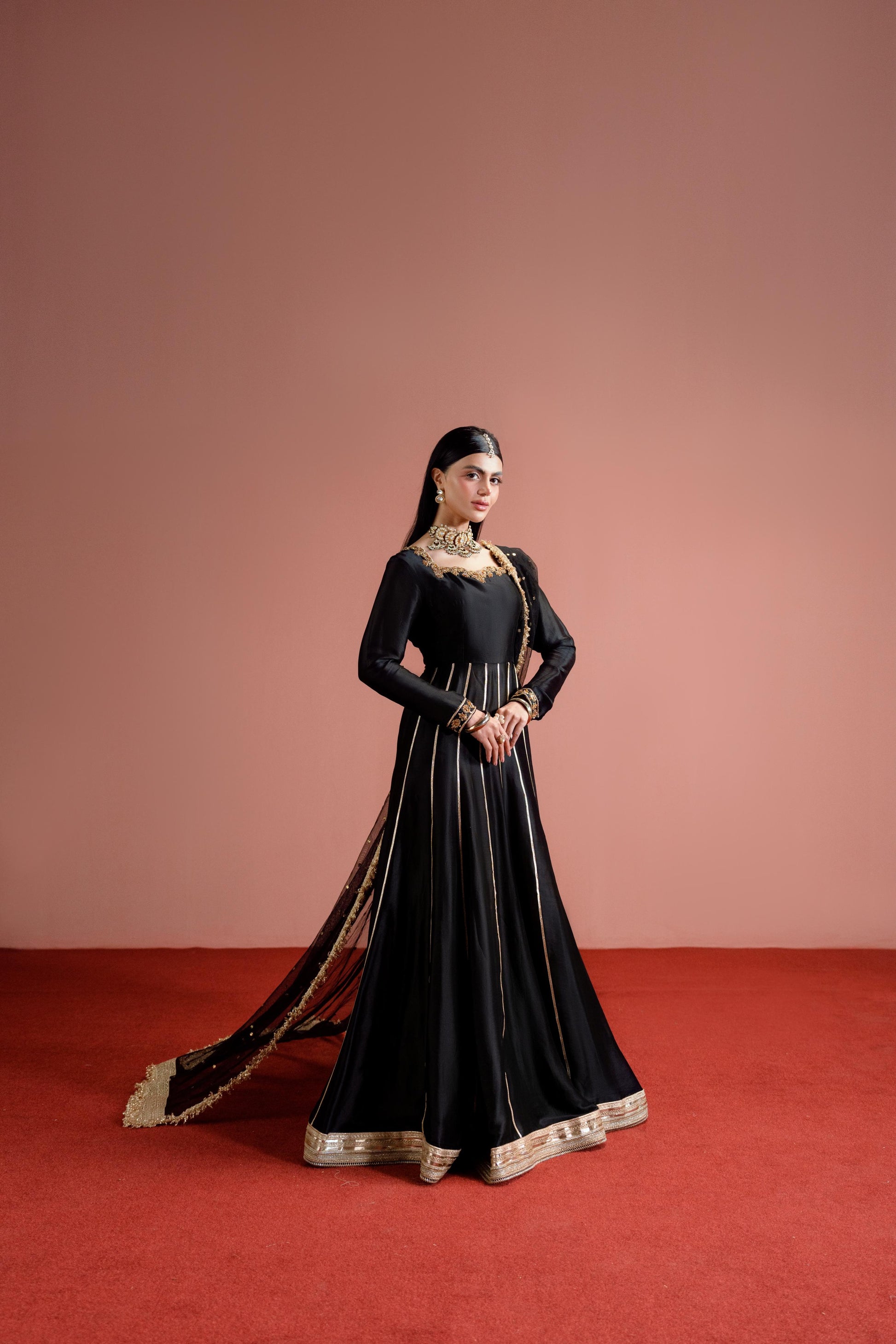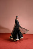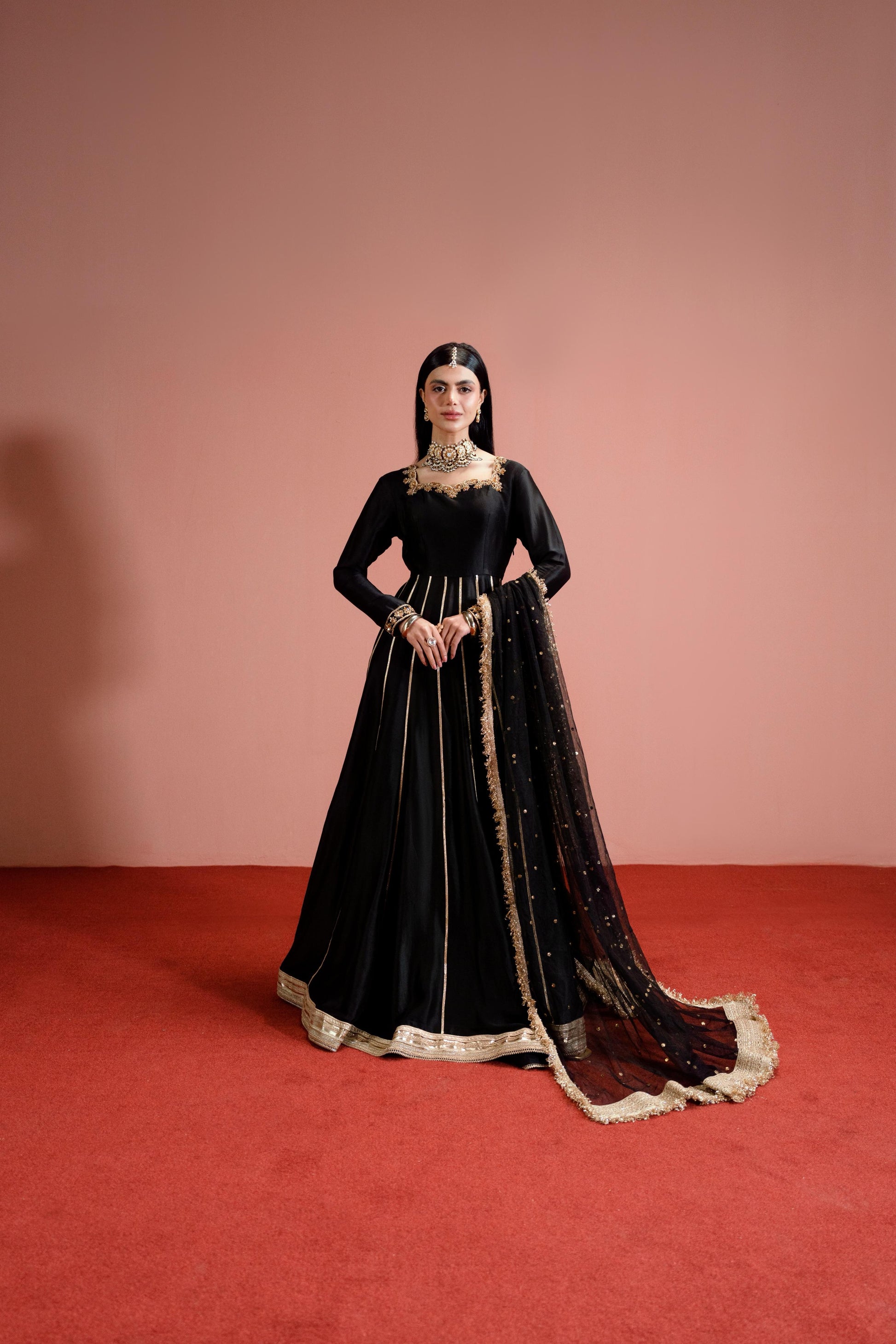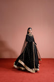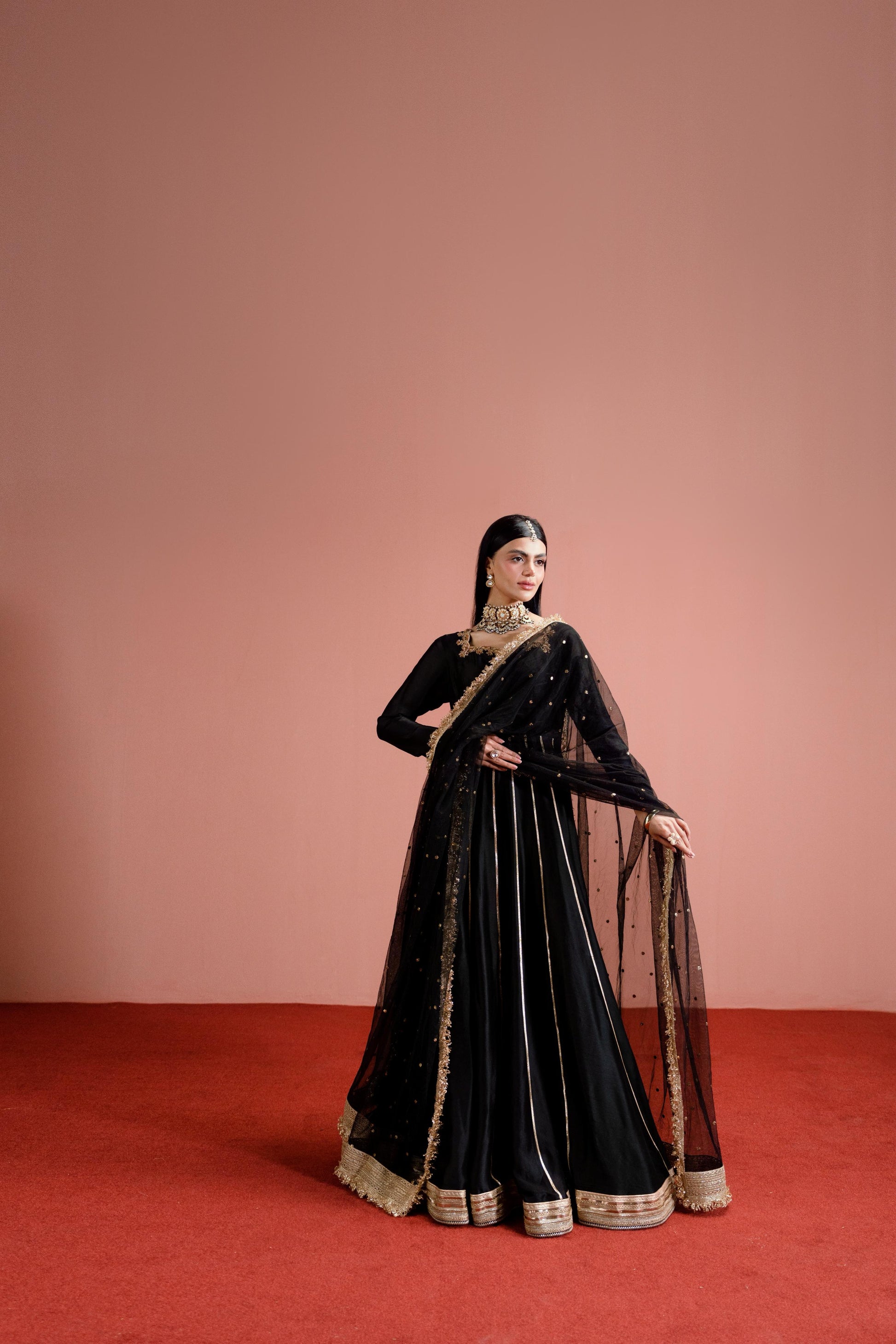 Enhanced with delicate handwork and naqshi, sitara detailing. Wafa radiates sophistication. Crafted on black Sheesha silk pishwas features an attached embellished bodice and golden lace border. The silhouette is fitted through the bodice with voluminous flare. Paired with net mukesh dupatta with borders on all four sides for an elegant drape.